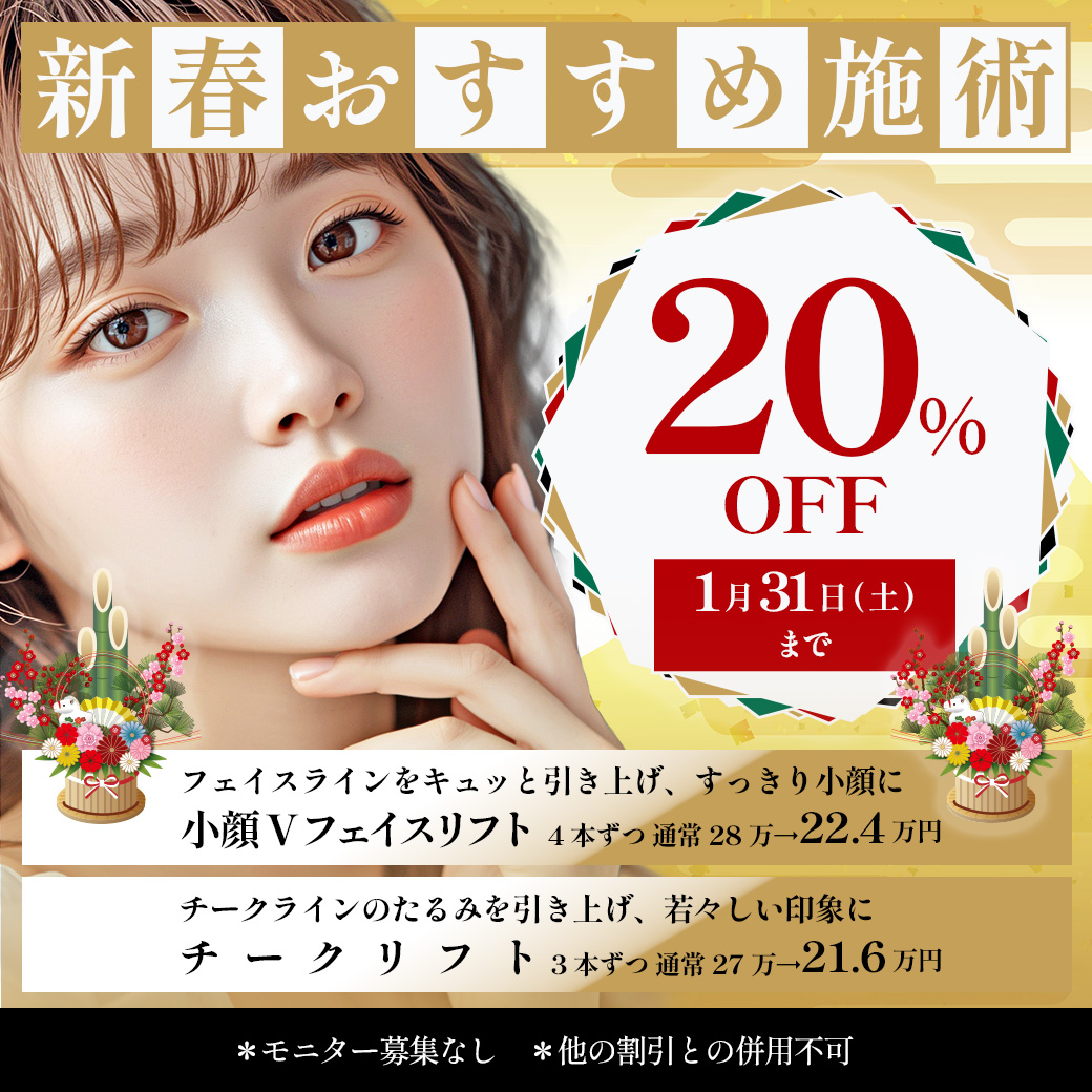 3本ずつ 通常 270,000 → 216,000円 - 小顔Vフェイスリフト、チークリフトともに、上記本数だけではなく、すべての本数で割引対象
